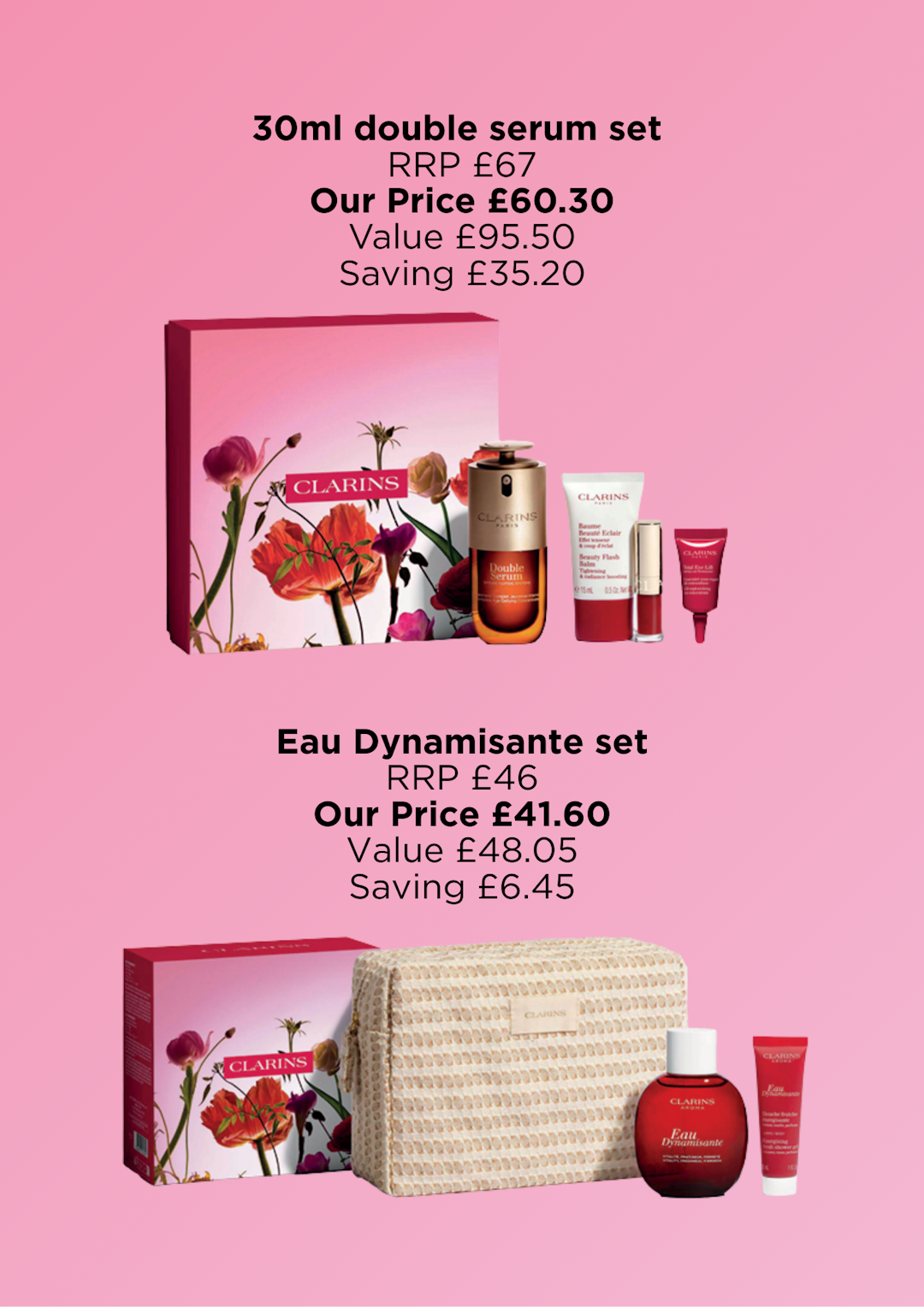 Beautifully Gift wrapped and travel size Eau Dynamisante and mascara in Clarins bespoke box /whilst stocks last 🥰